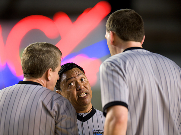 A lot of times, it’s not “chimping” (looking through your just-recorded images on the LCD screen of your camera) during timeouts and finding animation in a face like official Al Perez, set against the neon art installation at the Tacoma Dome (yes, I have a thing for neon).
