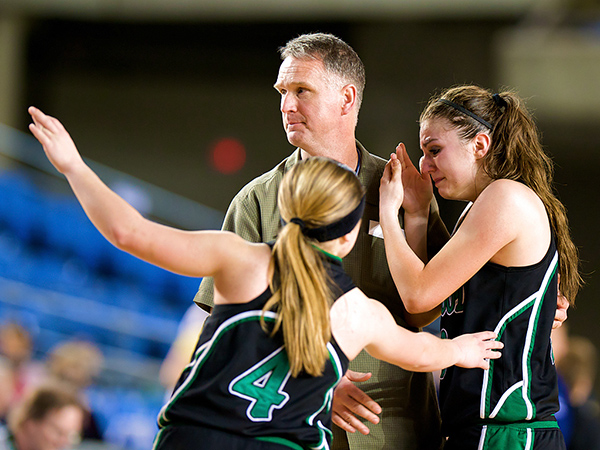 Finally, I might keep shooting after a play because the aftermath is more interesting. Here, Kentwood’s Sanda Milovic is consoled by an assistant coach and teammate Kylie Huerta after she missed a potentially game-tying shot during an upset loss to Mead.