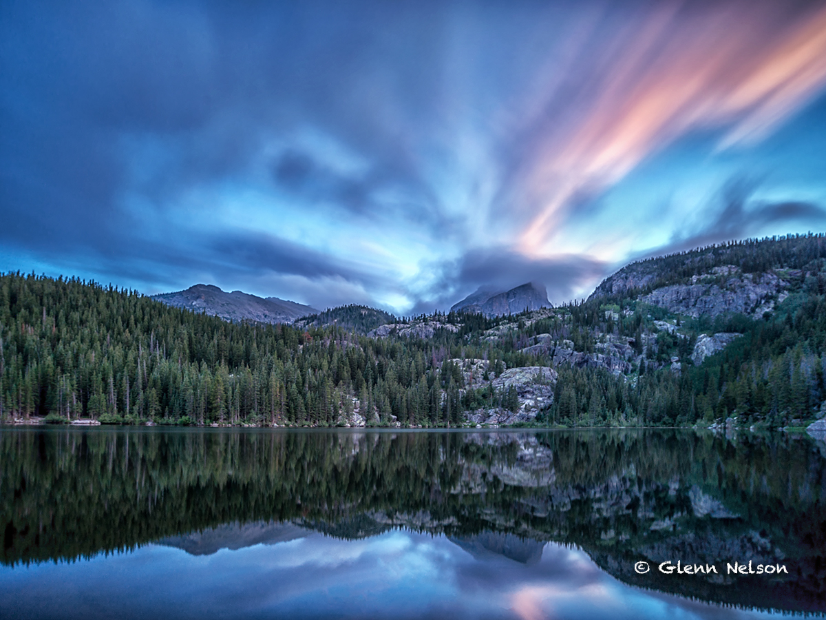 Later, we literally ran up to the trail encircling Bear Lake, with the sun diving quickly. I knew I wanted Hallett Peak in the background and searched frantically for some foreground subject matter. Finding none, I decided to rely on the reflection off the glassy smooth lake to draw eyes into the scene. Then I waited for the spectacular sunset that never came. This was to be my only sunset at RMNP so, seeing some clouds begin to roll in, I attached a 10-stop ND filter and went for a long exposure (nearly three minutes) in hopes of getting some decent color and cloud movement.