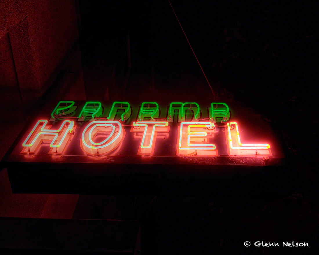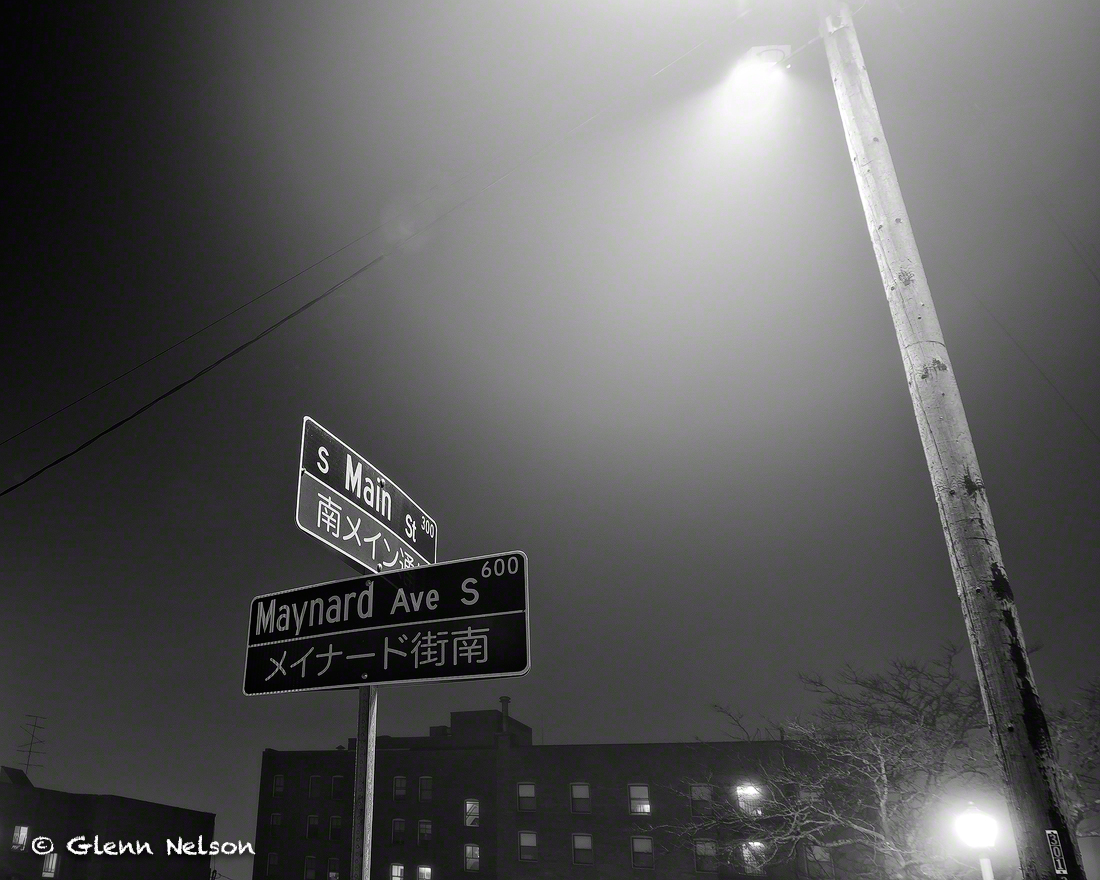 Five of my entries eventually landed among the top 100 images in the contest, all of which were on display on Dec. 5 in a space next to the Panama Hotel. Four of those were taken on a single, cold and foggy October night, and the subject of two of those was the Panama, including the following, “Panama Alley.” The scene, especially the stacked green-lit, fire-escape landings, caught my eye as soon as I arrived. I also liked the three spotlights, to play off the three green squares.
