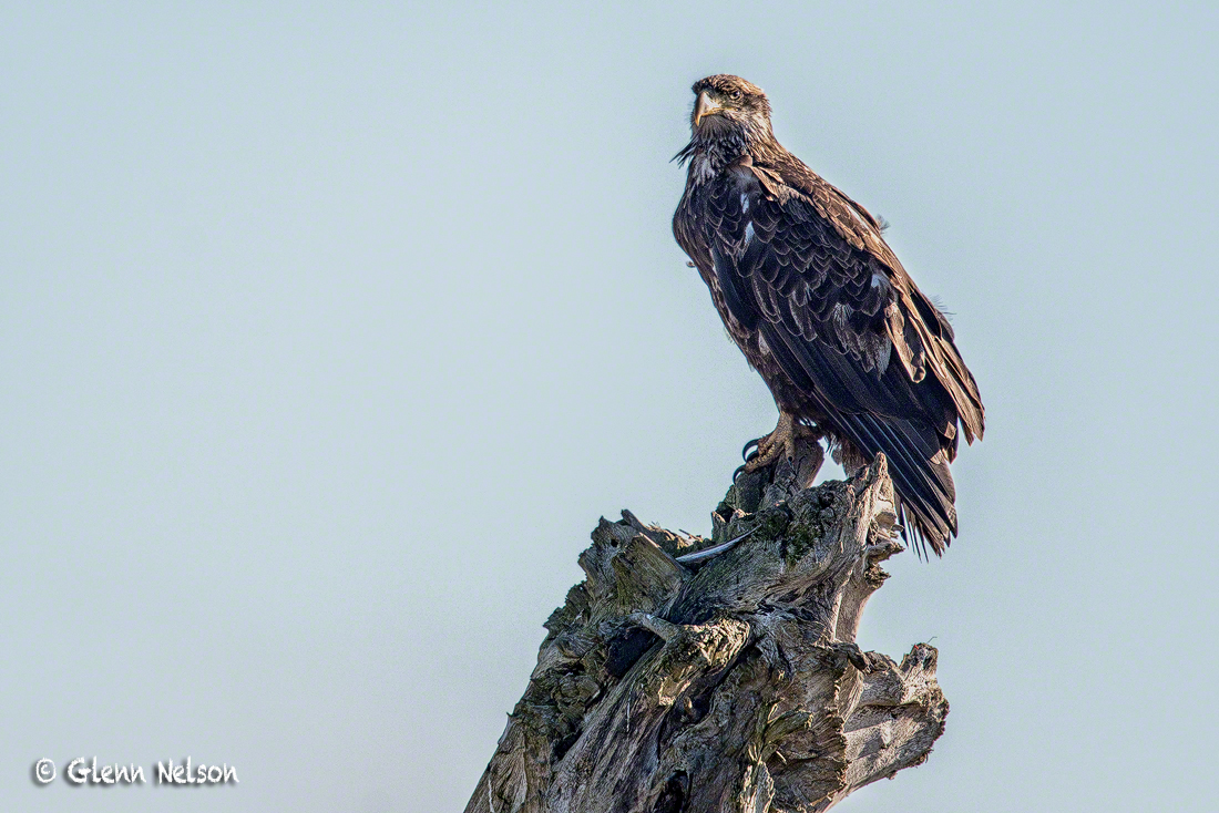 This juvenile was easy to find because it was atop the tallest perch at West 90, a leaning snag in the southwest corner, on the dike along Padilla Bay. I was a mile away when I saw it, and the bird remained stationary as I hiked toward it. Compared to other birds of prey, Bald Eagles can be pretty tolerant of humans carrying cameras with long lenses. And indeed this one allowed me to approach pretty closely.