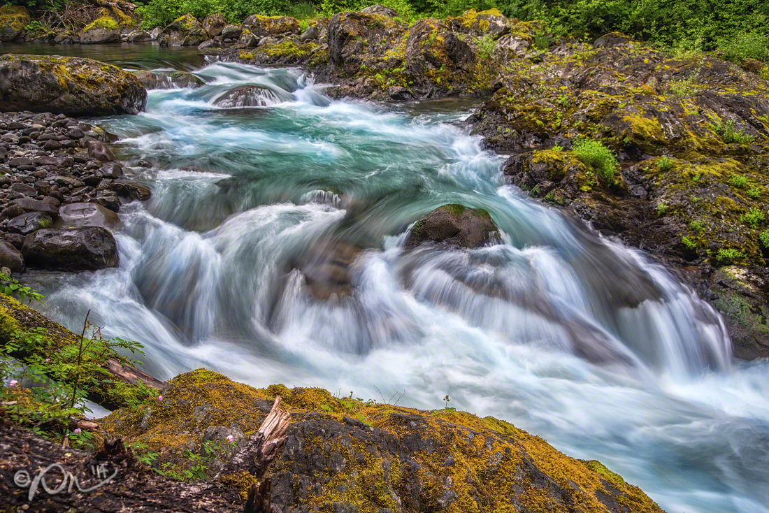 However, I failed to come up with anything special, even after returning early the next morning. On the access road out, I stopped at a marked spot, “Salmon Cascades,” that I reflexively passed three times before because of a camera icon on the sign, which said to me that everybody and their brother made a cheap picture there.